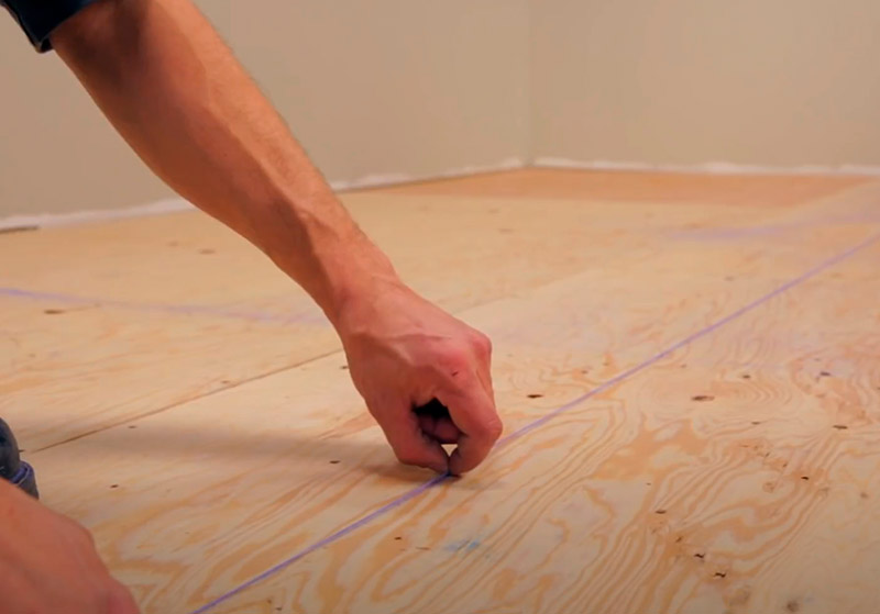 Фанерные листы укладываются с зазором 3–5 мм между собой и около 10 мм от стен. Эти компенсационные швы позволяют материалу реагировать на изменения влажности без деформации всей поверхности. Крепление выполняется саморезами с частым шагом, чтобы лист был максимально прижат к основанию.
